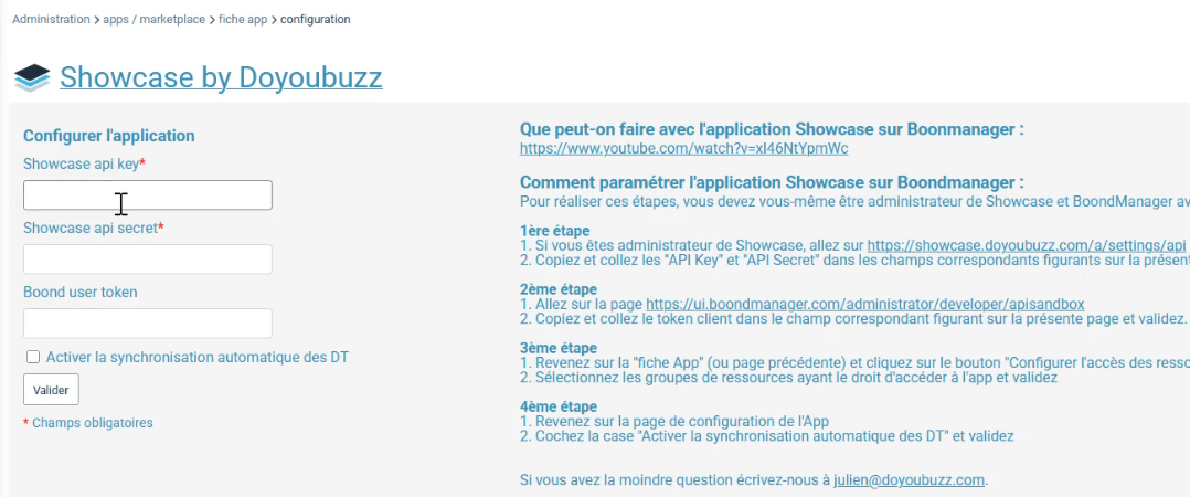 Pour que BoondManager et Showcase puisse communiquer, il faut maintenant remplir les clés d'API des deux outils.